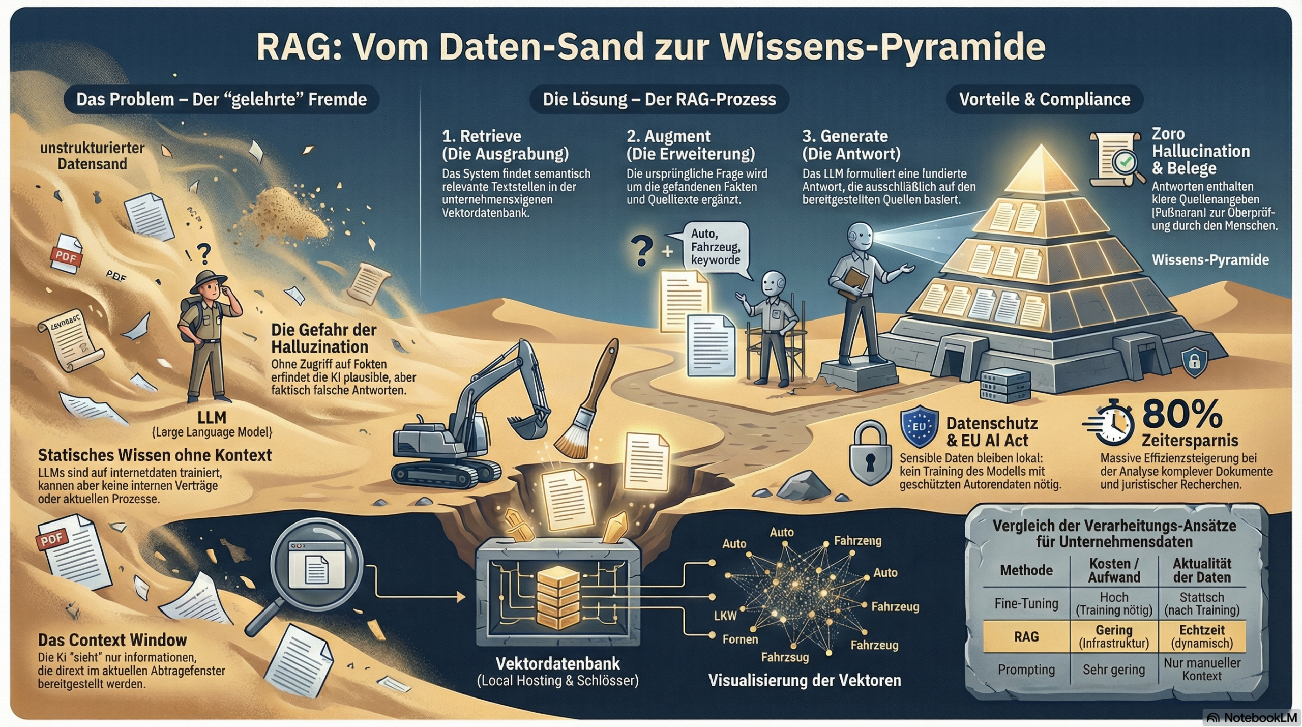 Anhand einer Reise durch Ägypten wird gezeigt, wie Wissen strukturiert, gefunden und nutzbar gemacht werden kann. Die Bilder von Wüste, Bibliotheken und Ausgrabungen stehen dabei für reale technische Konzepte, die hinter modernen KI Architekturen stehen.